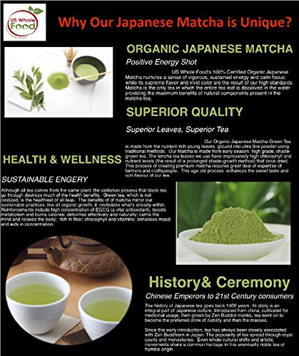 - US Whole Food Organic Matcha is Antioxidants Powerhouse - Boost Metabolism - Enhances immune system - Improves cholesterol - Excellent Substitute of Coffee - Improve skin & hair - Great for Weight Management Why choose US WHOLE FOOD ORGANIC MATCHA: - 100% Certified Organic USDA & JAS