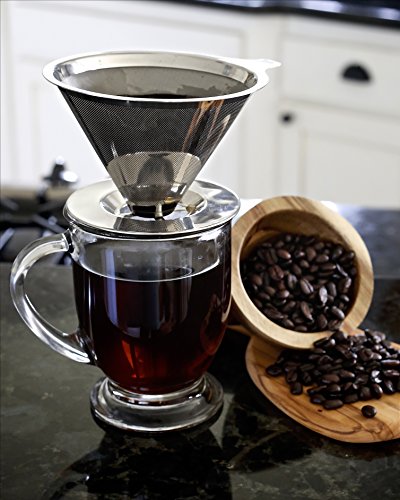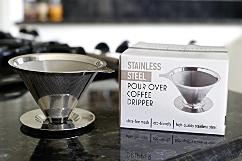 • MAKE COFFEE LIKE THE PROS - The new hottest trend in manual brewing, our stainless steel pour over coffee dripper allows you to brew delicious cups of coffee just like expert baristas. The dripper is durable and reusable and an extended lip on the base of the dripper keeps it secure on your mug while you brew.