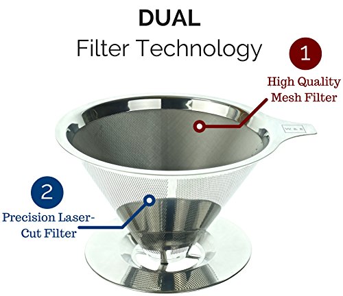 • DUAL FILTER TECHNOLOGY - Unlike other coffee drippers, ours features high quality 18/8 stainless steel with dual filtration: a fine high-quality mesh on the inside, and a laser-cut filter on the outside. This design prevents any grounds from getting in your coffee, while allowing the oils and nutrients to pass through to your cup, ensuring a better tasting cup of coffee.