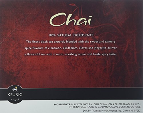 Twinings blends to perfection the finest black teas with the sweet and savoury spice flavours of cinnamon, cardamom, cloves and ginger to give you a line of great-tasting Chai teas with a daring, spicy taste and rich, vibrant aroma. Contains 48 K-Cups (2 Boxes of 24 K-Cups every)